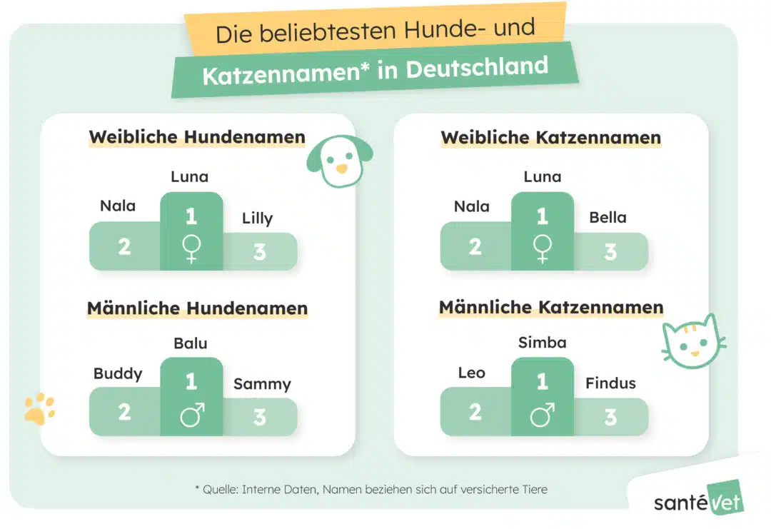 Die Trends bei den Namen für Haustiere in Deutschland enthüllen, dass männliche Hunde am häufigsten auf Balu, Buddy und Sammy hören. Bei Hündinnen führen Luna, Nala und Lilly die Liste der Namen an. Den Spitzenplatz bei den Hunderassen nimmt der Labrador ein.